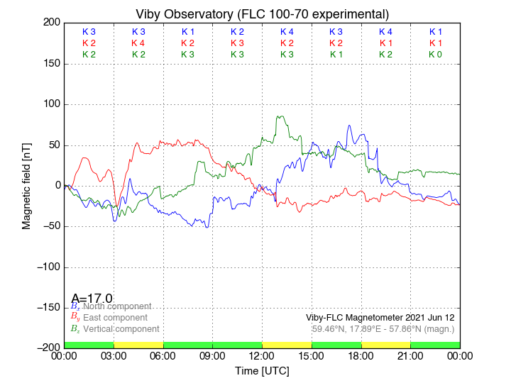Magnetometer Viby Viby (Sollentuna), Sweden · geographic coordinates: 59°27' N 17°54 E · geomagnetic coordinates (2017): 57.69°N, 106.22°E |