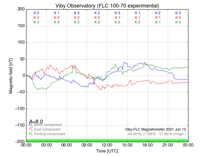 Magnetometer Viby Viby (Sollentuna), Sweden · geographic coordinates: 59°27' N 17°54 E · geomagnetic coordinates (2017): 57.69°N, 106.22°E |