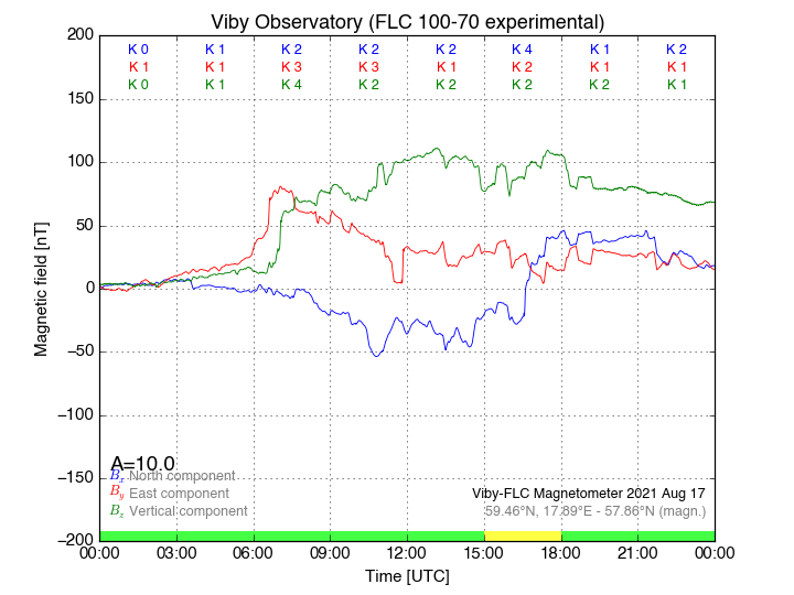 Magnetometer Viby Viby (Sollentuna), Sweden · geographic coordinates: 59°27' N 17°54 E · geomagnetic coordinates (2017): 57.69°N, 106.22°E |