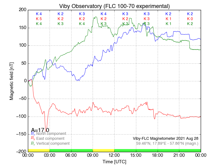 Magnetometer Viby Viby (Sollentuna), Sweden · geographic coordinates: 59°27' N 17°54 E · geomagnetic coordinates (2017): 57.69°N, 106.22°E |