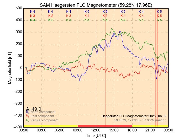 Magnetometer Viby Viby (Sollentuna), Sweden · geographic coordinates: 59°27' N 17°54 E · geomagnetic coordinates (2017): 57.69°N, 106.22°E |