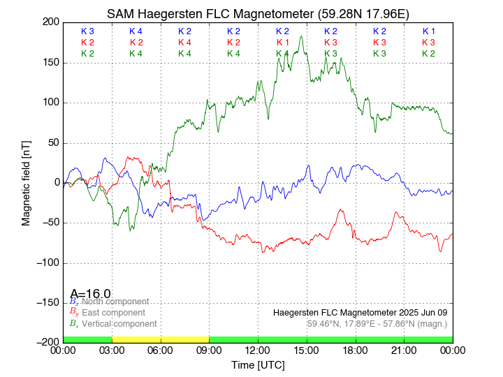 Magnetometer Viby Viby (Sollentuna), Sweden · geographic coordinates: 59°27' N 17°54 E · geomagnetic coordinates (2017): 57.69°N, 106.22°E |