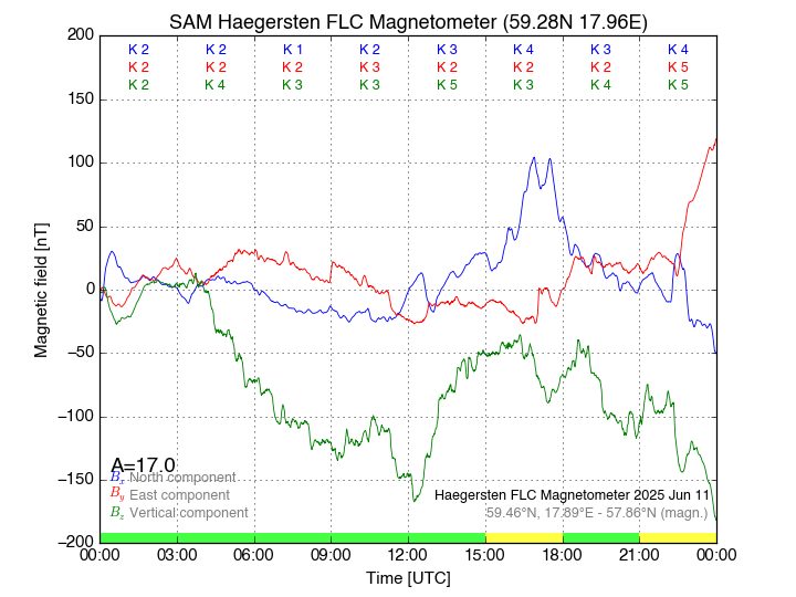 Magnetometer Viby Viby (Sollentuna), Sweden · geographic coordinates: 59°27' N 17°54 E · geomagnetic coordinates (2017): 57.69°N, 106.22°E |