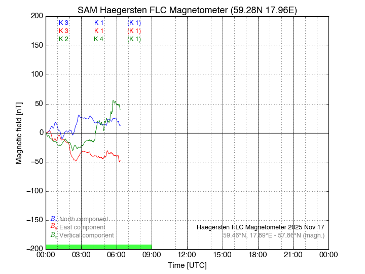 Magnetometer Viby Viby (Sollentuna), Sweden · geographic coordinates: 59°27' N 17°54 E · geomagnetic coordinates (2017): 57.69°N, 106.22°E |